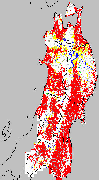 安全作期の策定にある気温指標のうち、いもち病蔓延可能日の平均気温指標20.0℃を用いて表示し、20.0℃未満については1℃刻みで表示します。過去7日の移動平均値で示しています。いもち病の蔓延可能域を監視するものです。葉いもち発生予察メッシュと併せてご覧ください。