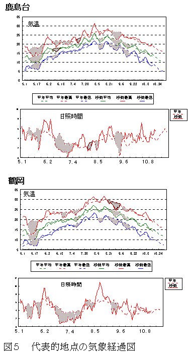 本年度の気象の特徴をみるために、太平洋側と日本海側の代表的な地点の気象経過図を図5に示す。これは気温と日照時間の平年値と本年の値を前7日間の移動平均で図示したものである。