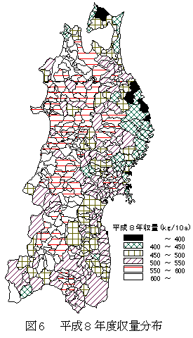 平成8年度収量分布を図6、また冷害危険度地帯別平均収量を表4に示す。