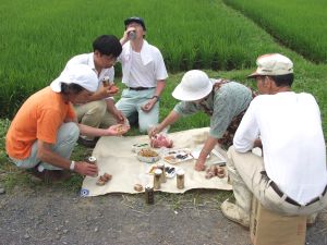 ・航空機多波長域走査データを収集した範囲で、数カ所で水稲の生育と葉いもち発生程度を調査する。薬剤散布している風景が所々で見られる。本年度の主要な実験がすべて無事終わり、一同笑顔で盛岡に帰る。