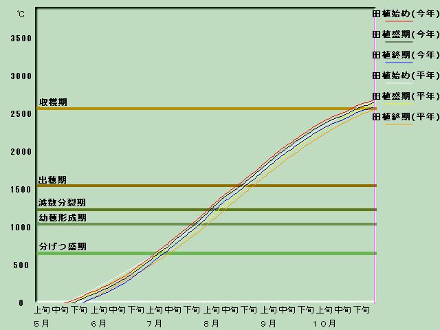 積算平均 気温 | 660度日 | 1050度日 | 1240度日 | 1550度日 | 2580度日 |