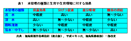 水管理の種類には,浅水,深水,間断灌漑,落水(中干し)等があり,期待される効果は表1の通りである。
