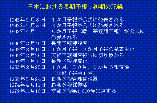 日本の長期予報の歴史は外日本の長期予報の歴史は外国と異なる。アメリカでは週間予報から1か月予報、そして3か月予報と進んだ。だが、日本の場合はまず、暖候期(4月〜9月)の天候を予想する季節予報の研究から長期予報が始まった。