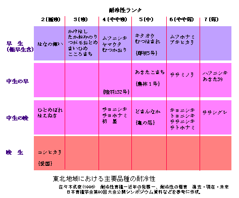 (参考資料:佐々木武彦(1996) 耐冷性育種−近年の発展−。耐冷性の稲育種 過去・現在・未来。日本育種学会第90回大会公開シンポジウム資料。5〜8頁。)